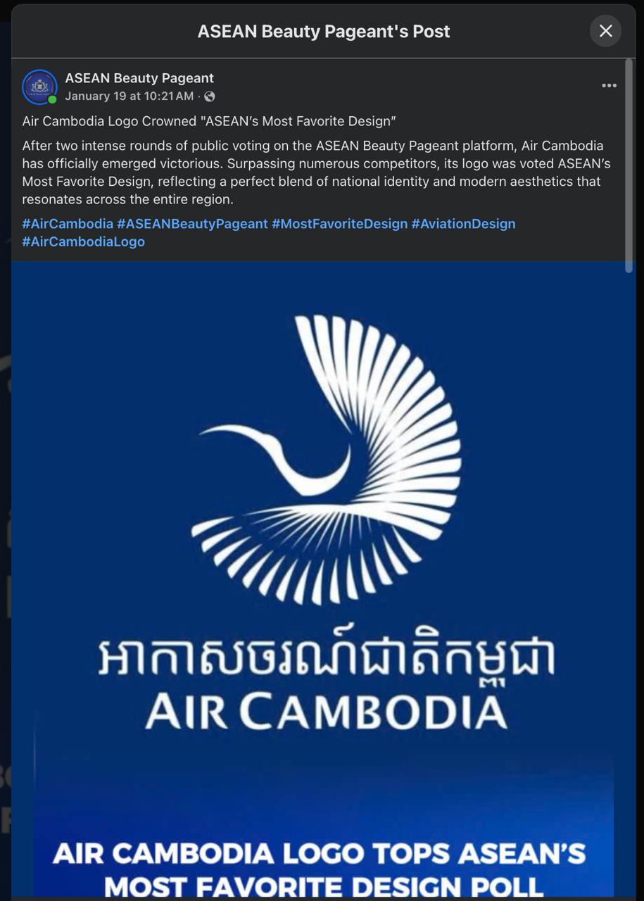 PHNOM PENH, Jan 21, 2026 — The newly unveiled logo of Cambodia’s national airline Air Cambodia has been voted the “Most Popular ASEAN Logo Design”, following a public poll organised by the ASEAN Beauty Pageant platform, drawing strong regional and international attention.