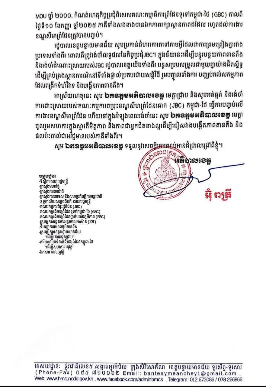Banteay Meanchey, October 9, 2025 ÷ According to an official letter dated 8 October 2025 from the Banteay Meanchey Provincial Administration addressed to the Governor of Sa Kaeo Province, Kingdom of Thailand, the location currently disputed by the Sa Kaeo Provincial Administration is situated in Chouk Chey Village, O Bei Chorn Commune, O Chrov District, Banteay Meanchey Province, Kingdom of Cambodia.