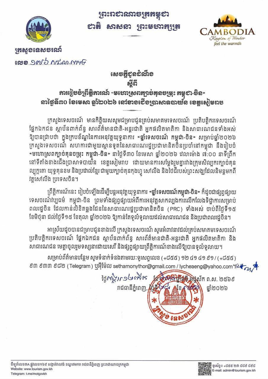 Authorities have invited tourism operators, media and the public to attend the free event, which begins at 7:00 a.m., highlighting Cambodia’s cultural appeal and its efforts to attract more international visitors.