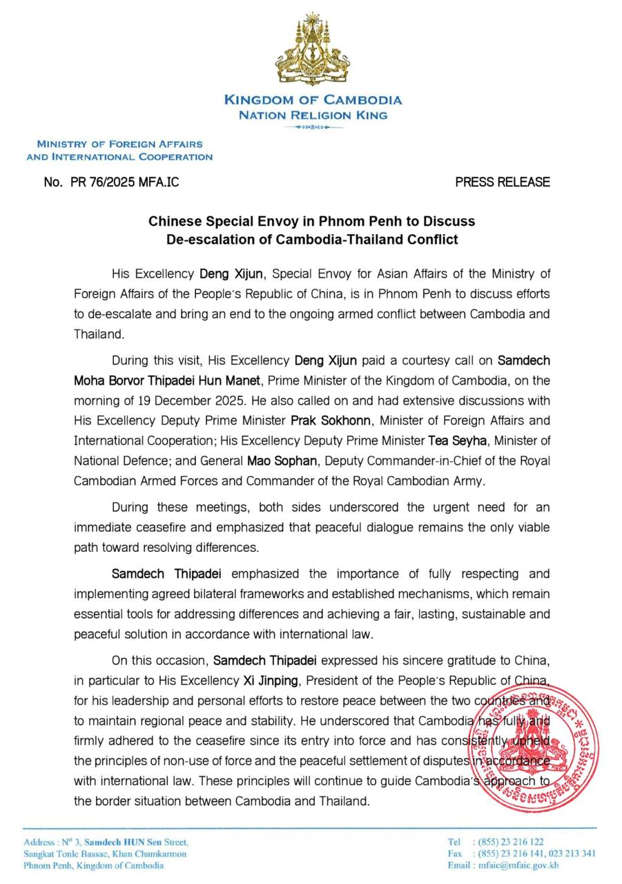 Phnom Penh, 19 December 2025 — His Excellency Deng Xijun, Special Envoy for Asian Affairs of the Ministry of Foreign Affairs of the People’s Republic of China, is in Phnom Penh to engage in high-level discussions aimed at de-escalating and ending the ongoing armed conflict between Cambodia and Thailand.