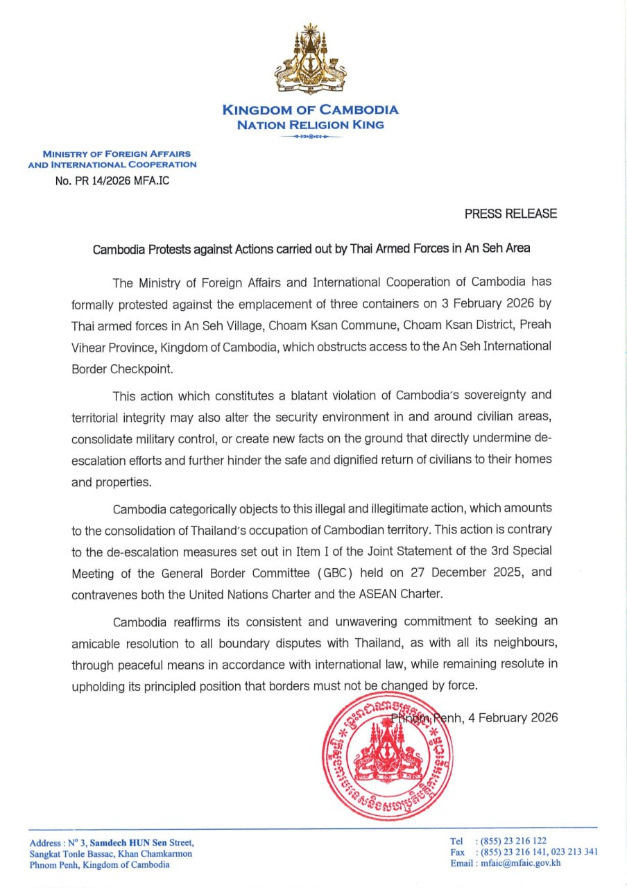 PHNOM PENH, Feb. 5, 2026 — Cambodia has lodged a formal protest against Thailand after Thai armed forces placed containers inside Cambodian territory near the An Seh International Border Checkpoint, the foreign ministry said on Wednesday.