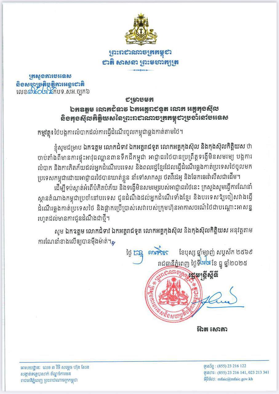 In an official notification addressed to Cambodian Ambassadors, Consuls General, and Honorary Consuls abroad, the Ministry stated that since the outbreak of armed aggression against Cambodia, Thai authorities have engaged in actions that cause serious inconvenience and fear to foreign travelers and Cambodian nationals transiting through Thailand en route to Cambodia.