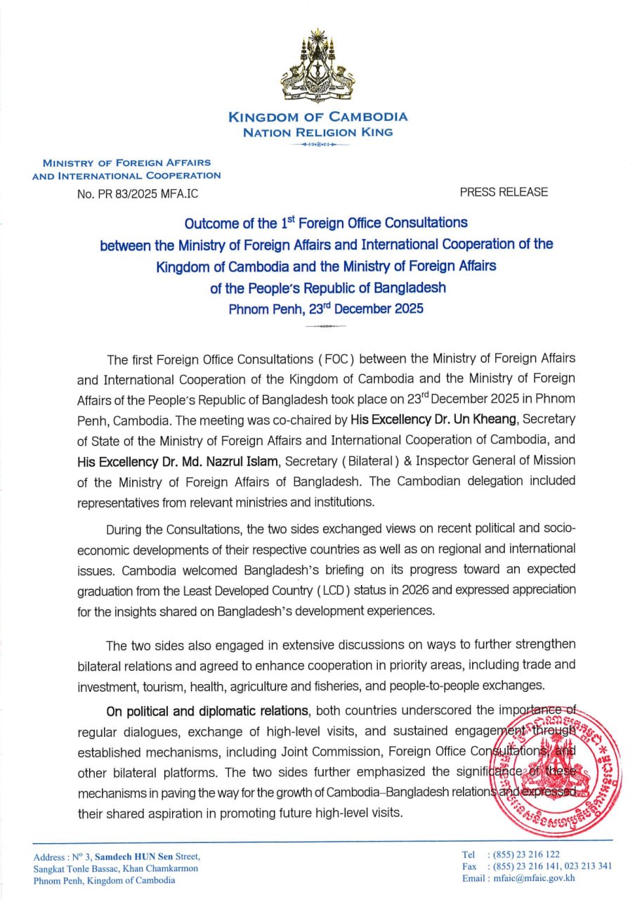 During the consultations, both countries exchanged views on recent political and socio-economic developments and regional and international issues. Cambodia welcomed Bangladesh’s briefing on its progress toward expected graduation from the Least Developed Country (LDC) status in 2026 and expressed appreciation for the insights shared on Bangladesh’s development experiences.