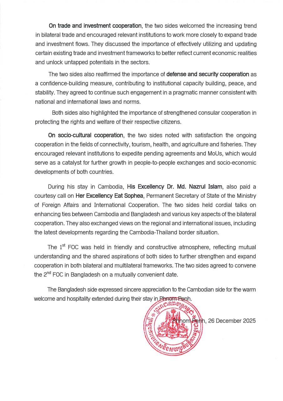 The two sides agreed to enhance cooperation in priority areas including trade and investment, tourism, health, agriculture, fisheries, and people-to-people exchanges. They also emphasized the importance of regular diplomatic dialogues, high-level visits, and the effective use of existing bilateral mechanisms, including the Joint Commission and the Foreign Office Consultations, to deepen Cambodia-Bangladesh relations.