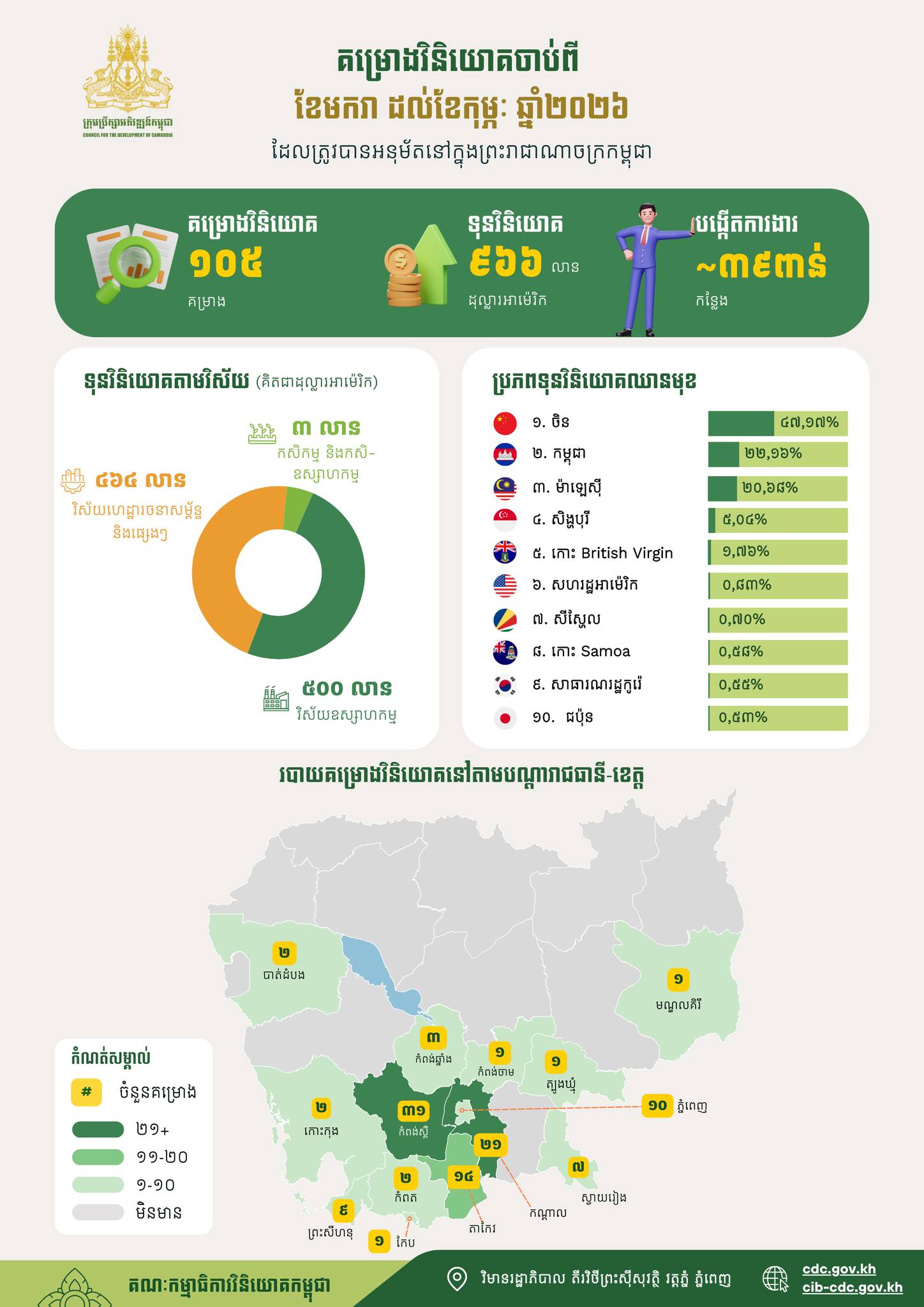 PHNOM PENH, March 12, 2026 — Cambodia approved 105 investment projects worth about $966 million in fixed assets in the first two months of 2026, generating around 39,000 jobs, the Council for the Development of Cambodia (CDC) said on Thursday.