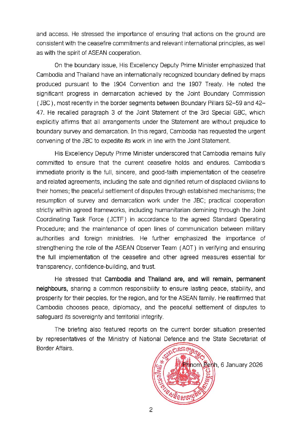 He concluded by reaffirming that Cambodia and Thailand are permanent neighbours with a shared responsibility to safeguard peace, stability, and prosperity for their peoples and the ASEAN region. Cambodia, he stressed, chooses peace, diplomacy, and the peaceful settlement of disputes to protect its sovereignty and territorial integrity.