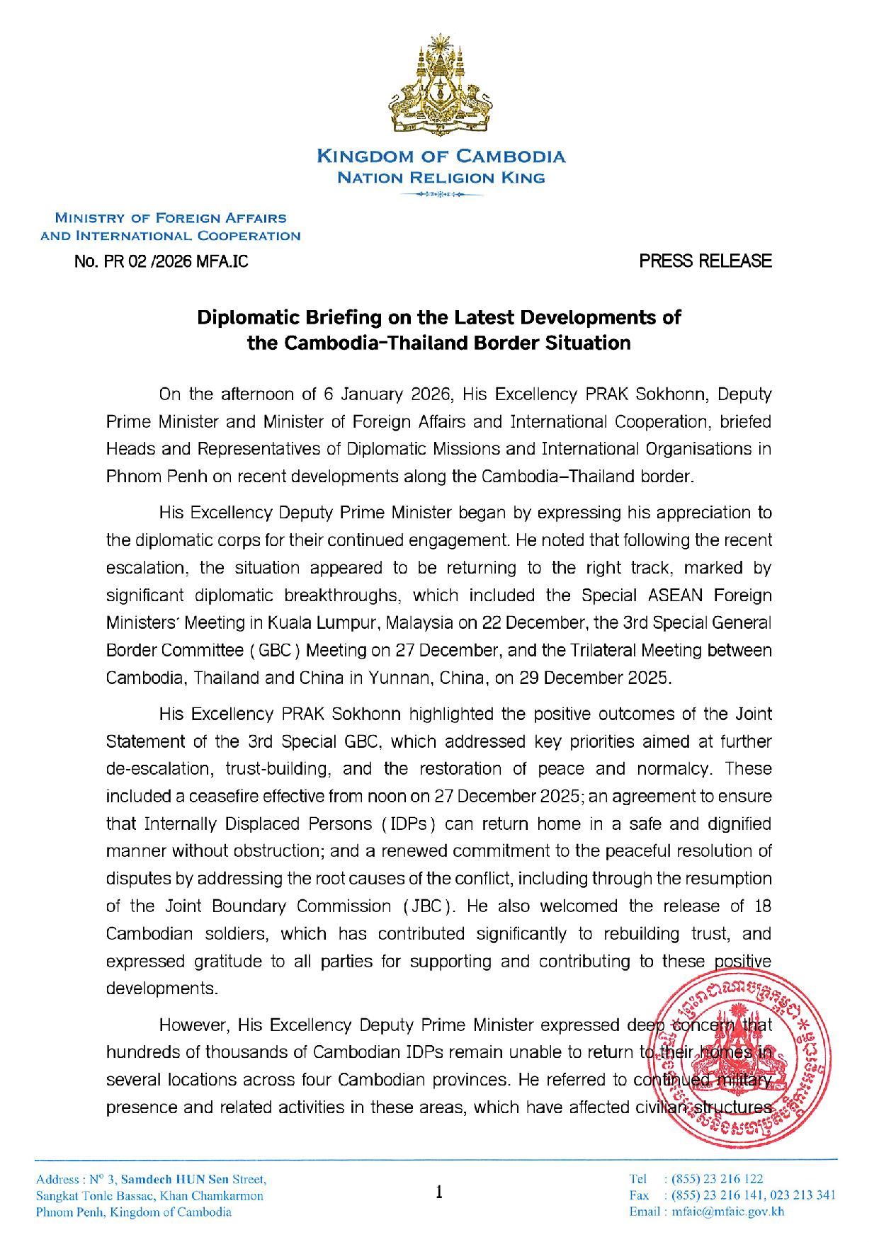 Phnom Penh, 6 January 2026 — His Excellency PRAK Sokhonn, Deputy Prime Minister and Minister of Foreign Affairs and International Cooperation of the Kingdom of Cambodia, today conducted a diplomatic briefing for Heads and Representatives of Diplomatic Missions and International Organizations in Phnom Penh on the latest developments along the Cambodia–Thailand border.