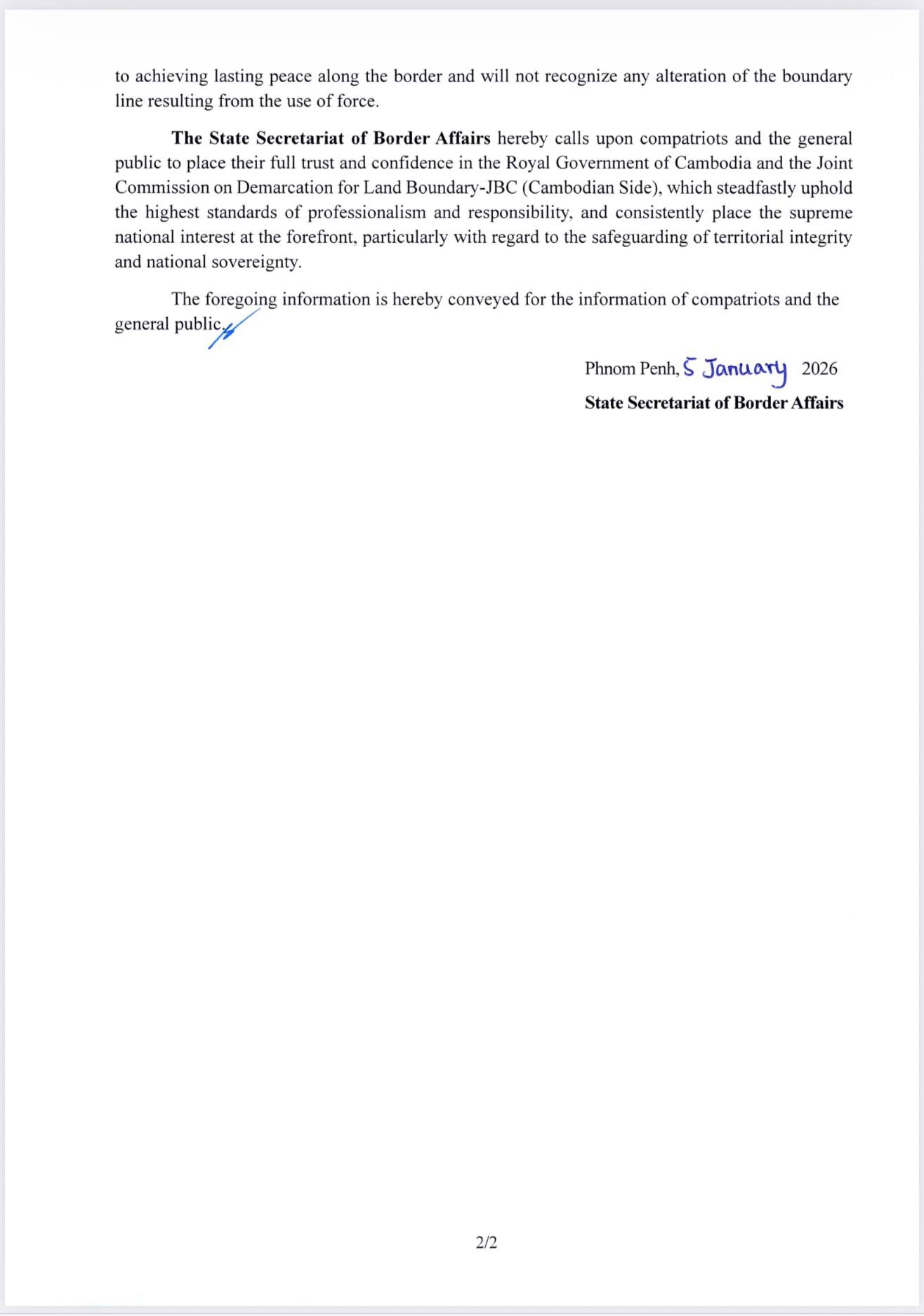 The State Secretariat called upon compatriots and the general public to place full trust and confidence in the Royal Government of Cambodia and the Cambodian Joint Boundary Commission, which it said continue to uphold professionalism, responsibility, and the supreme national interest in protecting Cambodia’s territorial integrity and national sovereignty.