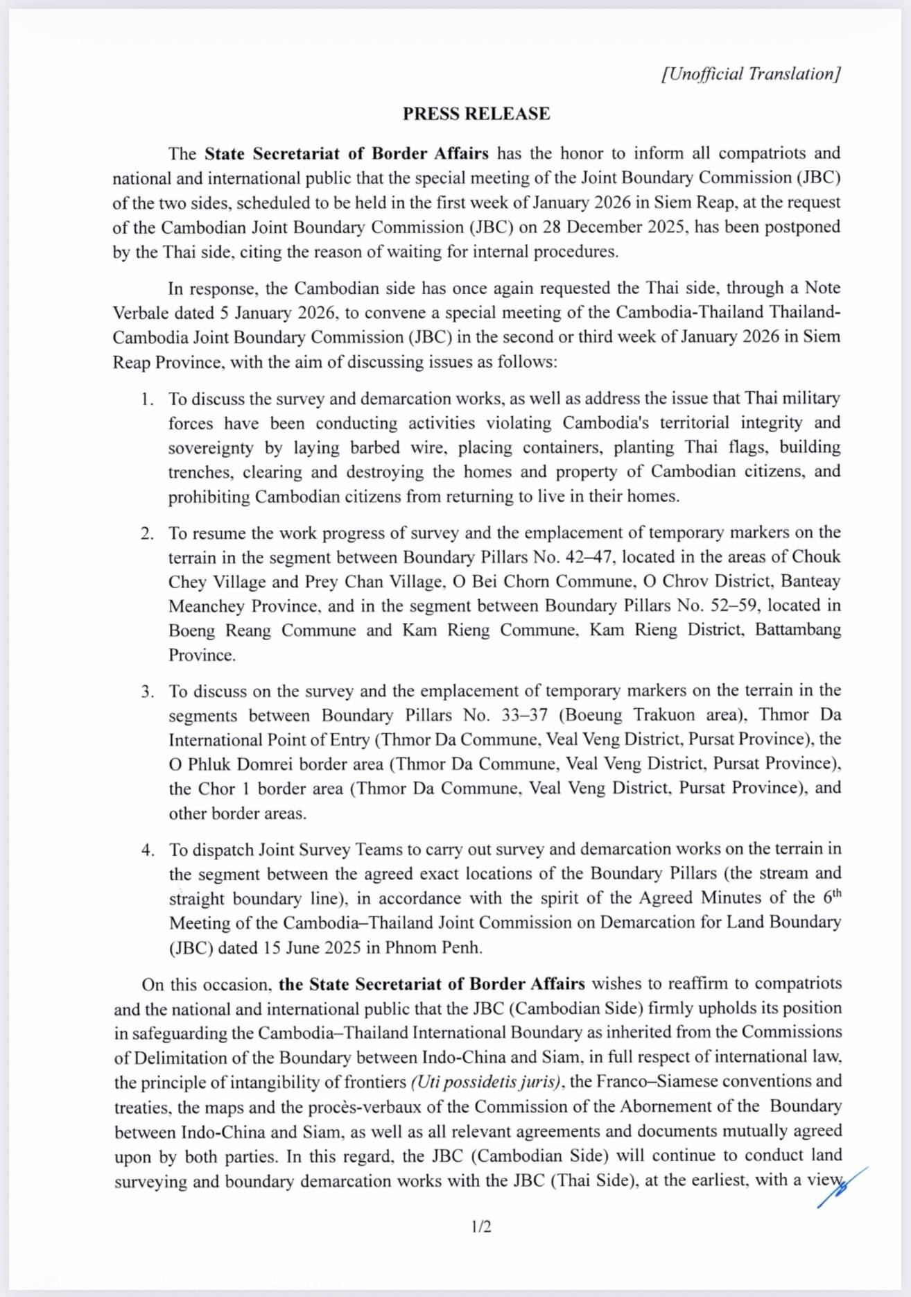 Phnom Penh, 5 January 2026 — The State Secretariat of Border Affairs of the Kingdom of Cambodia has informed compatriots and the national and international public that the special meeting of the Cambodia–Thailand Joint Boundary Commission (JBC), originally scheduled to take place in Siem Reap in the first week of January 2026 at the request of the Cambodian side, has been postponed by Thailand, citing the need to complete internal procedures.