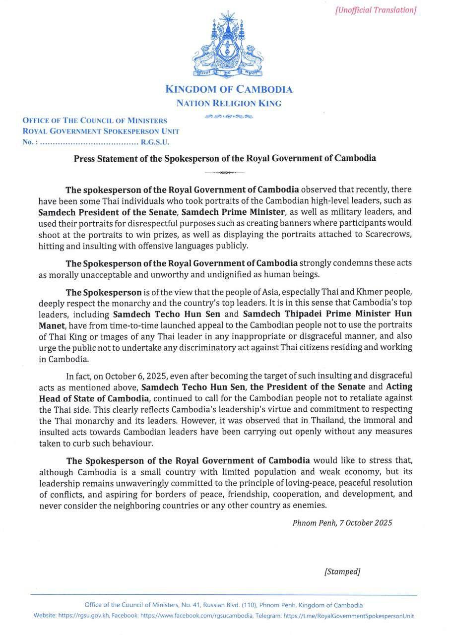 Phnom Penh, October 7, 2025: Shortly after the post on official Facebook page of Samdech Techo Hun Sen, President of the Senate of the Kingdom of Cambodia, posted a message revealing that some Thai nationals had used his portrait as a shooting target in exchange for a prize on the afternoon of Tuesday, 7 October 2025, the Royal Government Spokesperson Unit issued a strong statement condemning such behavior as immoral, degrading, and devoid of human dignity, declaring it completely unacceptable.
