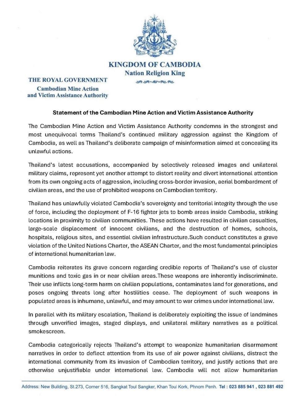 Cambodia further expressed grave concern over credible reports of Thailand’s use of cluster munitions and toxic gas in or near civilian areas, emphasizing that these weapons are inherently indiscriminate, cause long-term harm to civilian populations, contaminate land for generations, and may amount to war crimes under international law.