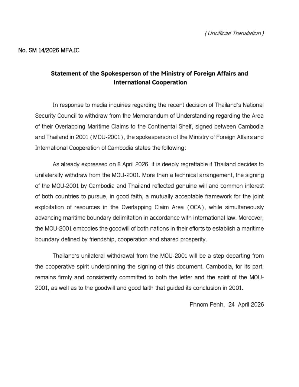 PHNOM PENH, April 25, 2026 — Cambodia said on Friday it would deeply regret any unilateral Thai withdrawal from a 2001 memorandum governing overlapping maritime claims, warning such a move would depart from the cooperative spirit underpinning the agreement.