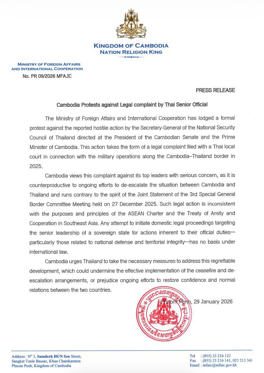 PHNOM PENH, Jan 29, 2026 — Ministry of Foreign Affairs and International Cooperation said on Thursday it had lodged a formal protest against what it described as a hostile legal action taken by a senior Thai official targeting Cambodia’s top leadership.