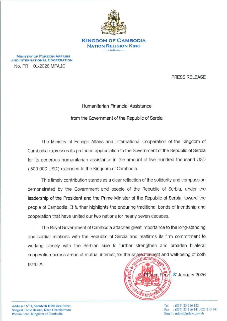 Phnom Penh, 5 January 2026 — The Ministry of Foreign Affairs and International Cooperation of the Kingdom of Cambodia has expressed its profound appreciation to the Government of the Republic of Serbia for its generous humanitarian financial assistance in the amount of USD 500,000, extended to support the people of Cambodia.