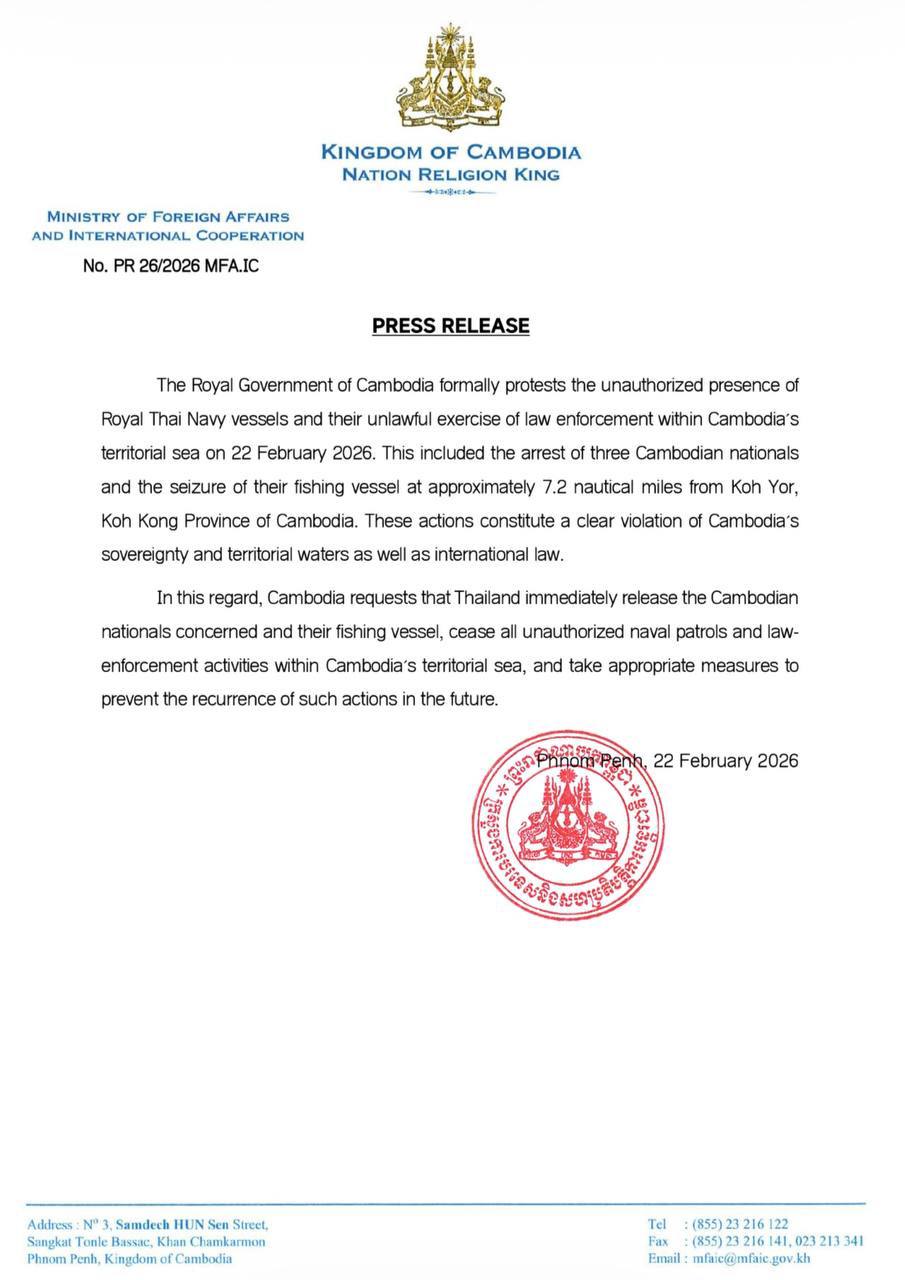 PHNOM PENH, Feb 22, 2026 — Cambodia on Sunday formally protested what it described as an unauthorized incursion by the Royal Thai Navy into its territorial waters, accusing Thai forces of violating its sovereignty and international law.