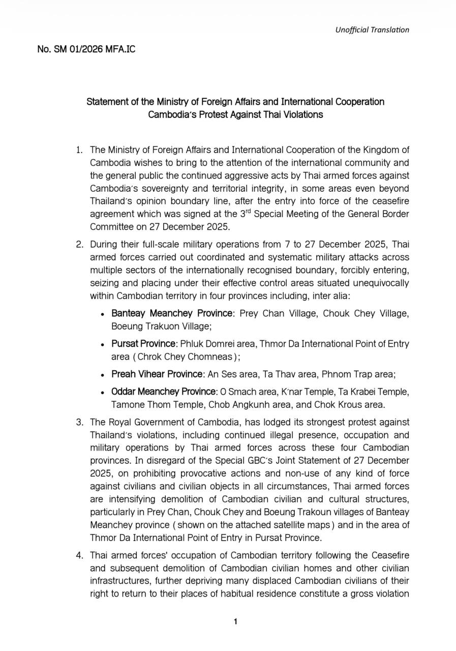 Phnom Penh, 2 January 2026 — The Ministry of Foreign Affairs and International Cooperation of the Kingdom of Cambodia has lodged a strong protest against Thailand over continued military violations of Cambodia’s sovereignty and territorial integrity, despite the ceasefire agreement reached at the Special Meeting of the General Border Committee on 27 December 2025.