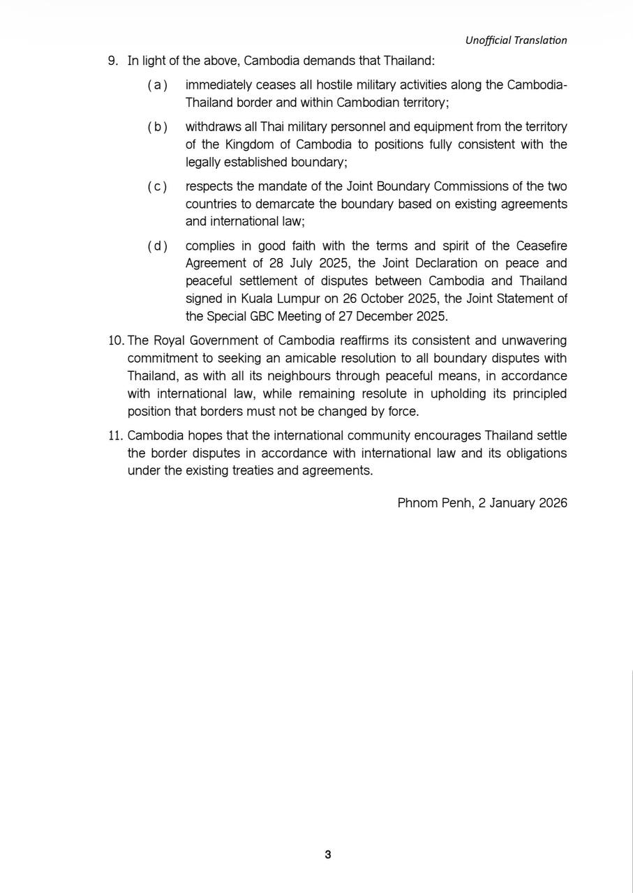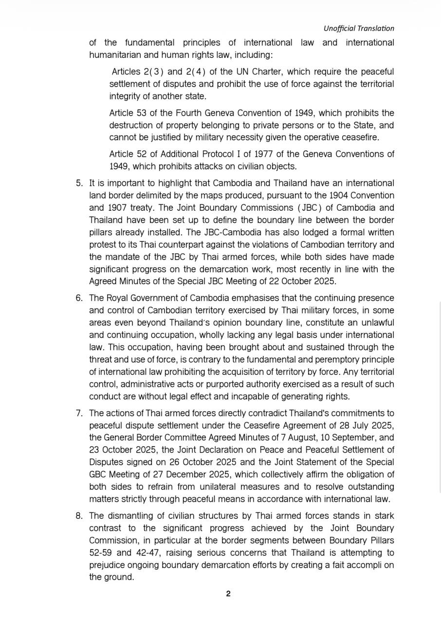 Cambodia stressed that the Cambodia–Thailand border is governed by the 1904 and 1907 treaties and that ongoing Thai military actions undermine the mandate of the Joint Boundary Commission and recent progress in border demarcation.