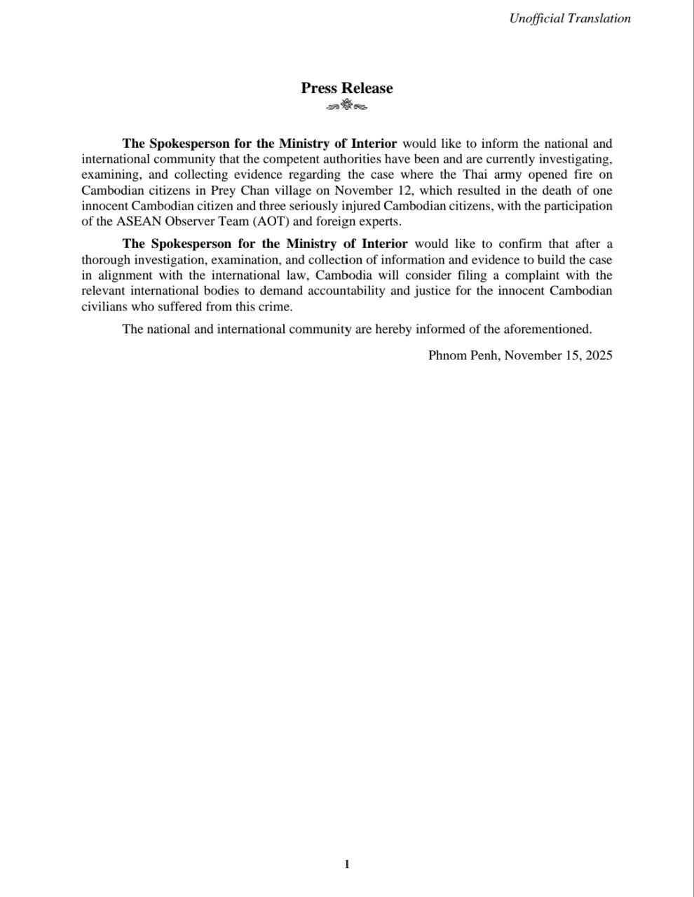 Phnom Penh, 15 November 2025 — One day after the Ministry of National Defence confirmed that the ASEAN Observer Team (AOT) had verified the fatality and injuries resulting from the Thai military’s unprovoked shooting of Cambodian civilians in Prey Chan village, the Ministry of Interior has issued a new statement detailing ongoing investigations and outlining potential next steps under international law.