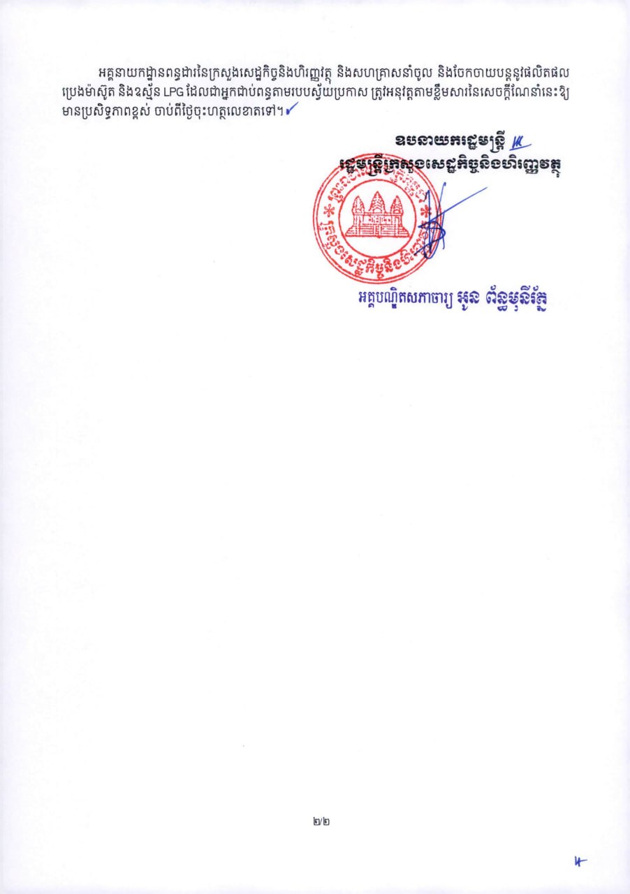 PHNOM PENH, April 6, 2026 — Cambodia’s government has announced it will fully absorb value-added tax (VAT) on diesel and liquefied petroleum gas (LPG) to help ease the impact of rising global fuel prices on households.