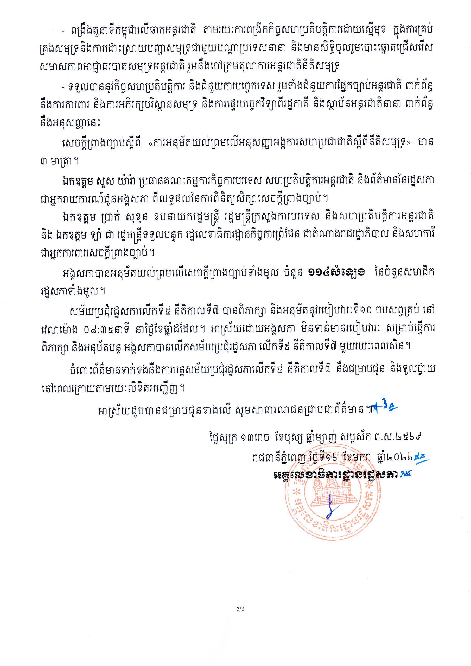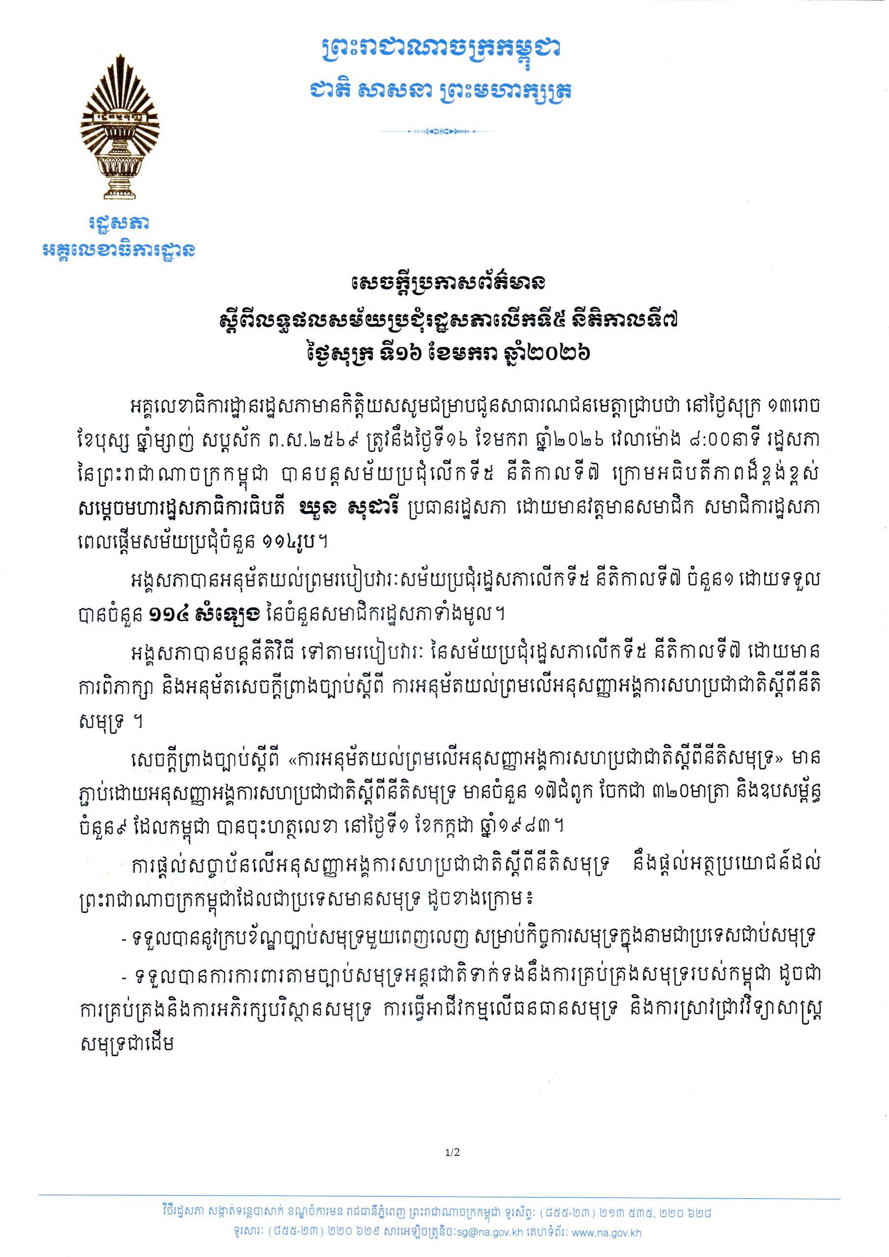 PHNOM PENH, 17 January 2026 — Cambodia’s National Assembly on Friday unanimously approved legislation to ratify the United Nations Convention on the Law of the Sea (UNCLOS), officials said, a move aimed at strengthening the country’s maritime legal framework and international cooperation.