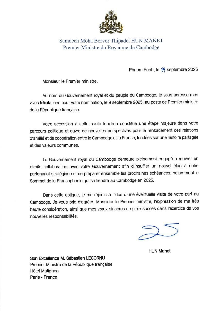 According to the congratulatory letter dated 14 September 2025, Prime Minister Hun Manet reaffirmed Cambodia’s strong commitment to working closely with France to inject new momentum into the Cambodia–France Strategic Partnership. He also stressed the importance of joint efforts in preparing for major upcoming events, in particular the Francophonie Summit to be held in Cambodia in 2026.