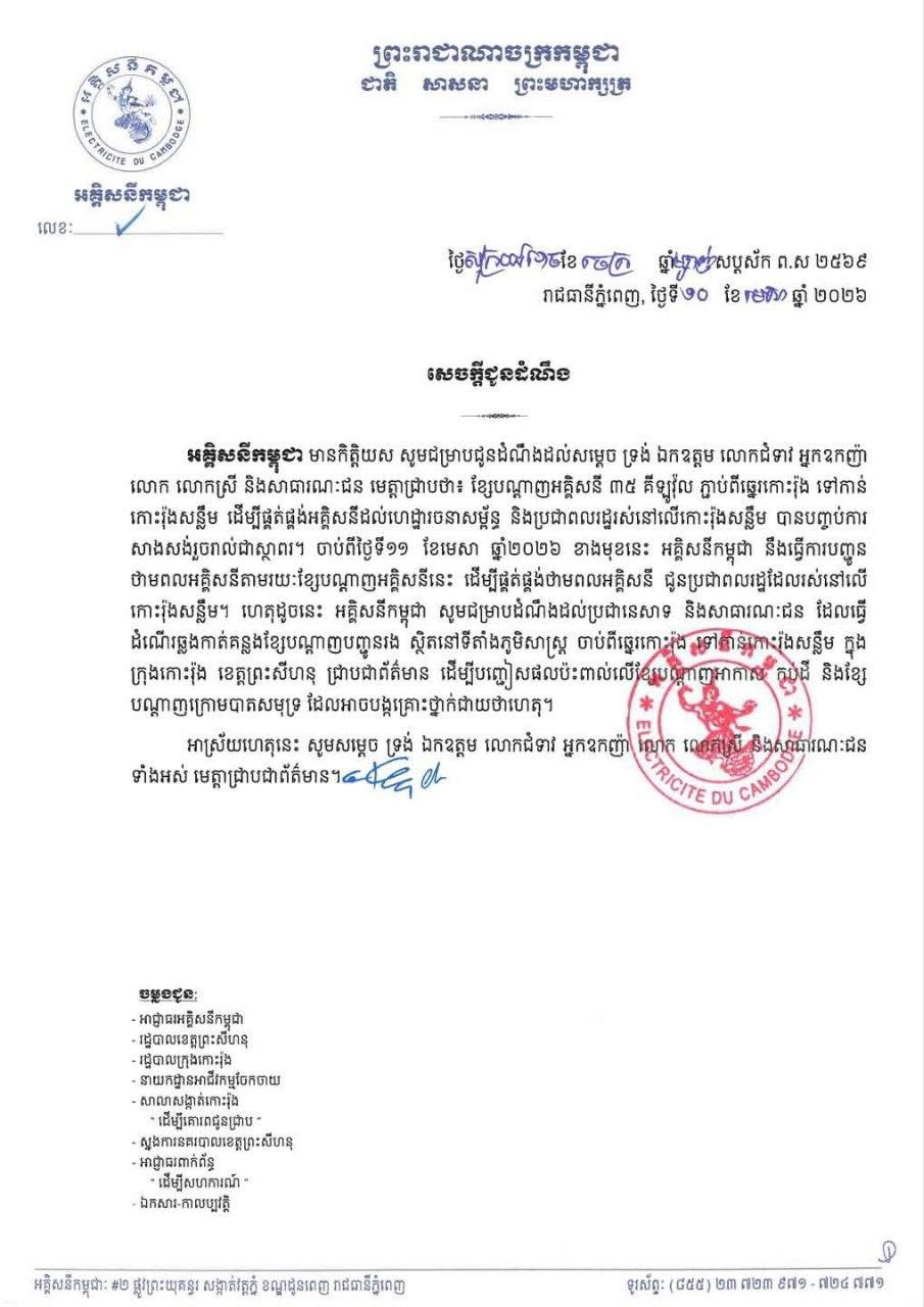 State utility Electricité du Cambodge (EDC) said the 35-kilovolt power line project, connecting the two islands in Preah Sihanouk province, was completed and officially put into operation on April 11.