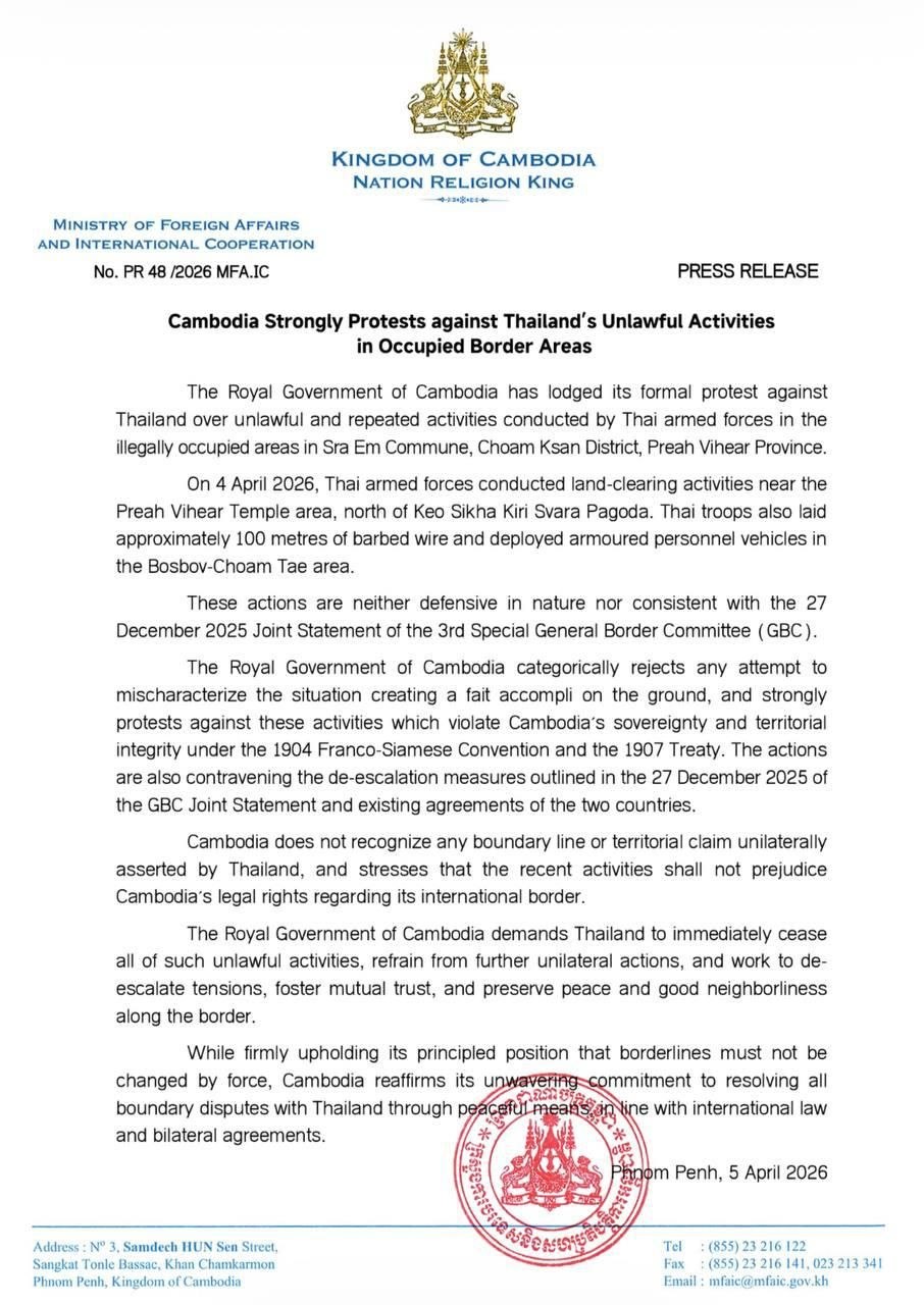 PHNOM PENH, April 5, 2026 — Cambodia has lodged a formal protest against Thailand over what it described as unlawful military activities in disputed border areas near the Preah Vihear Temple, calling on Bangkok to immediately halt the actions.
