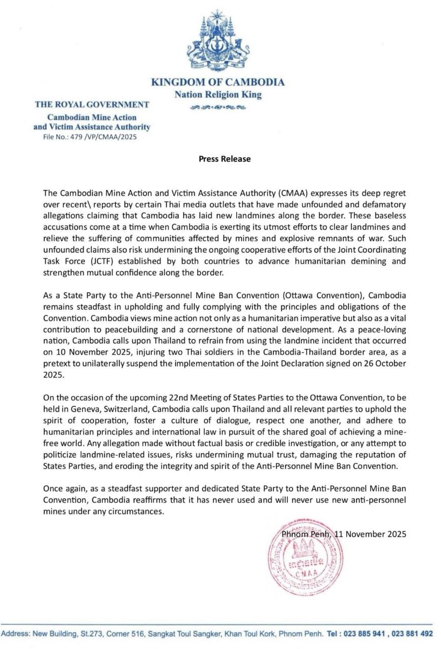 Phnom Penh, November 12, 2025 — The Cambodian Mine Action and Victim Assistance Authority (CMAA) has expressed deep regret over recent unfounded reports by certain Thai media outlets accusing Cambodia of laying new landmines along the border — claims it described as baseless, defamatory, and harmful to ongoing humanitarian cooperation.