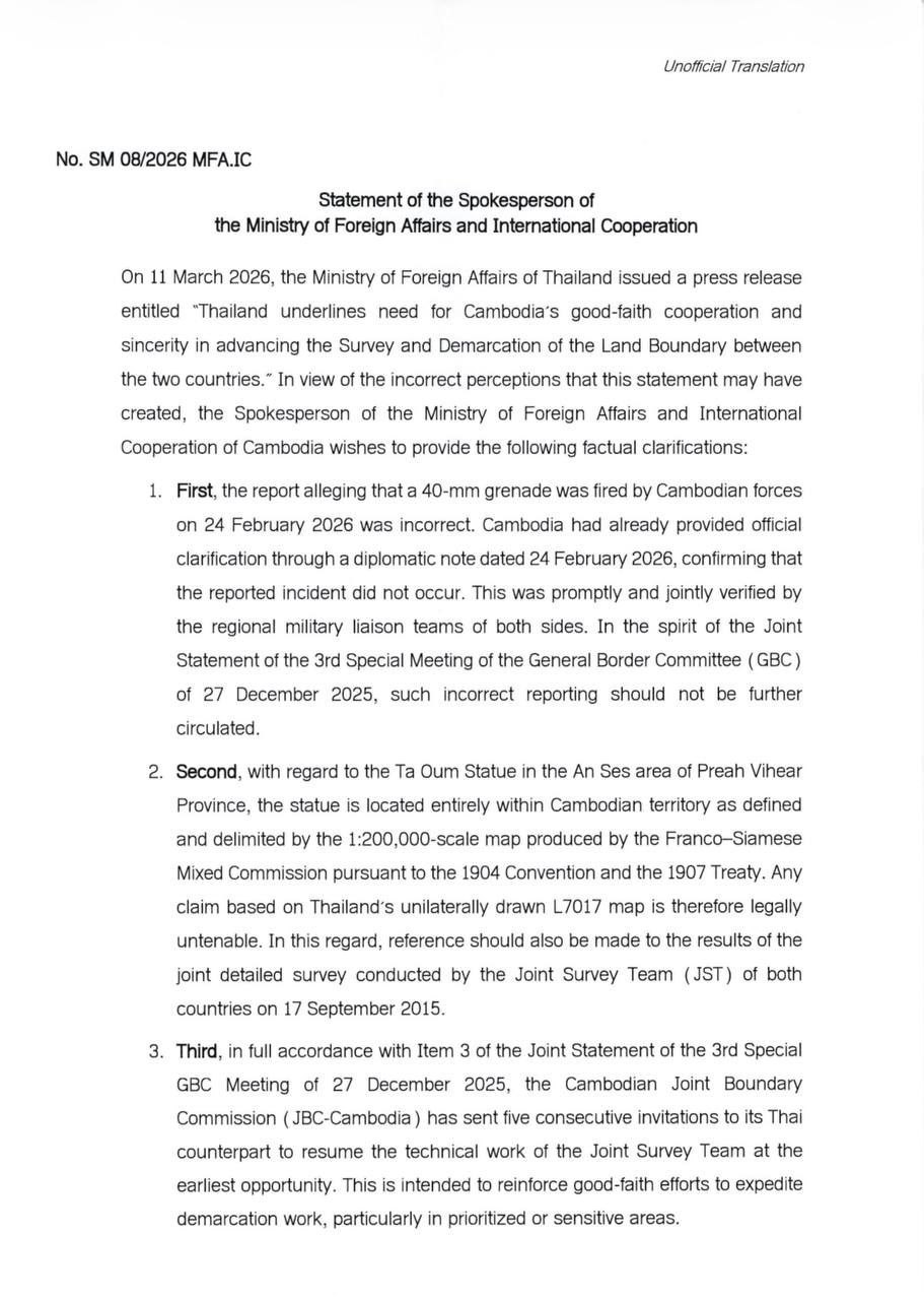 PHNOM PENH, March 12, 2026 — Cambodia on Thursday rejected allegations made by Thailand regarding a reported border incident and territorial claims, while reaffirming its commitment to resolving bilateral boundary issues through peaceful means and international law.