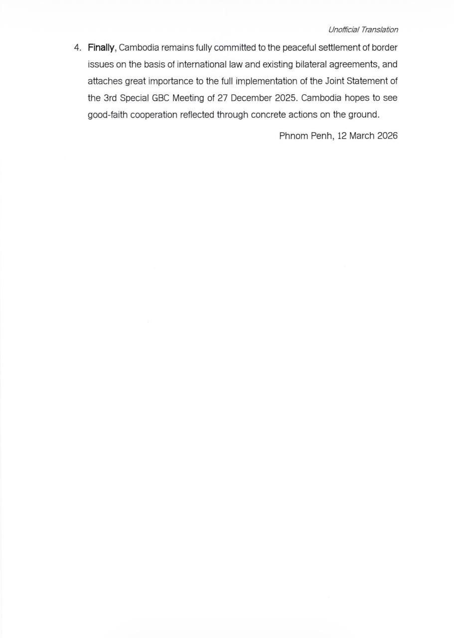 Phnom Penh reiterated that it remains committed to resolving border issues peacefully and in accordance with international law and existing bilateral agreements, including the Joint Statement of the 3rd Special Meeting of the General Border Committee signed on Dec. 27, 2025.