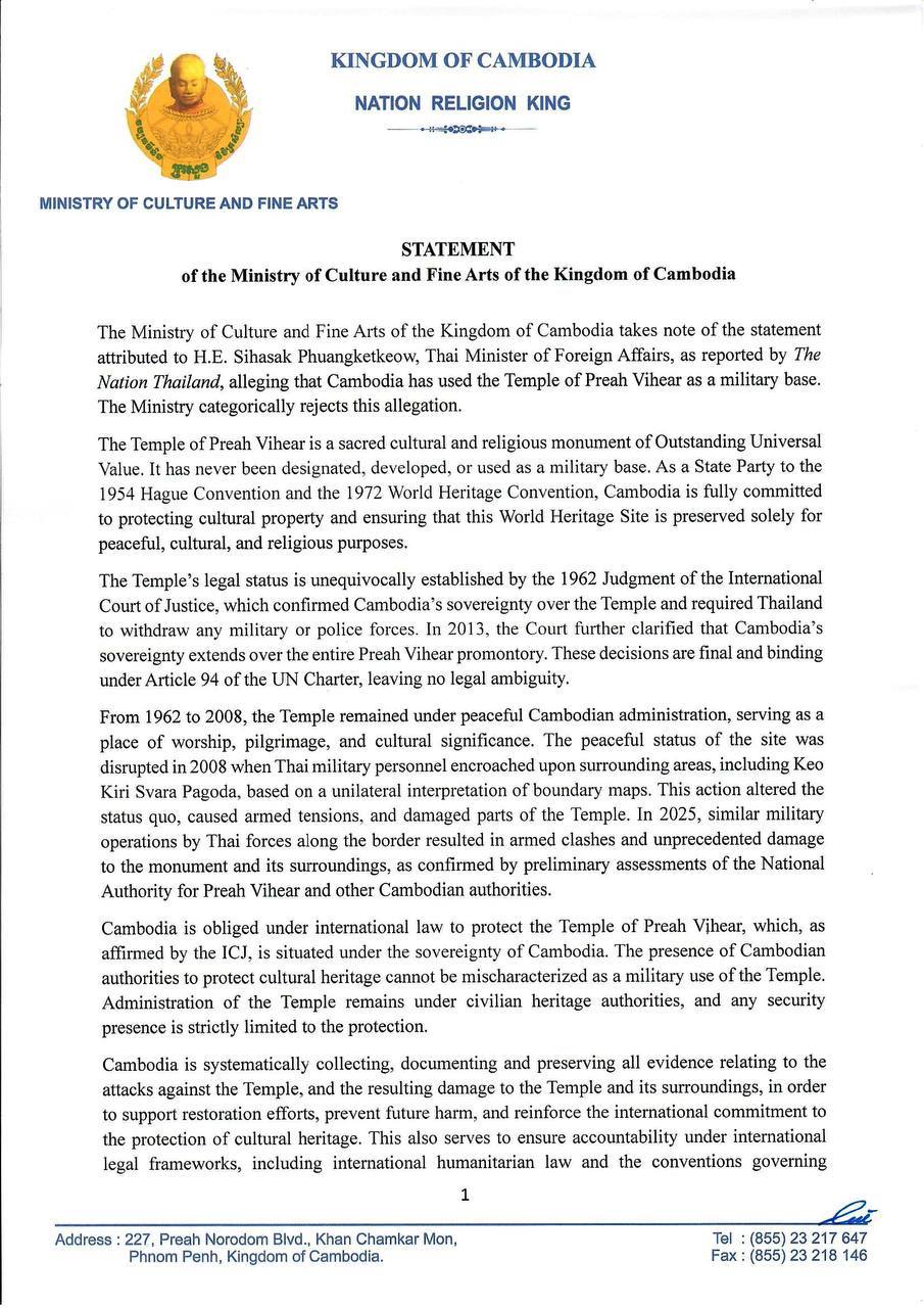 In a statement, Cambodia’s Ministry of Culture and Fine Arts responded to remarks attributed to Thai Foreign Minister Sihasak Phuangketkeow, reported by The Nation Thailand, alleging that Cambodia had used the temple for military purposes.