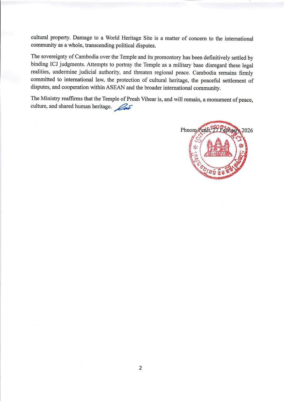 PHNOM PENH, Feb. 27, 2026 — Cambodia on Friday rejected allegations by Thailand’s foreign minister that the Temple of Preah Vihear had been used as a military base, calling the claim “categorically false” and reaffirming its sovereignty over the UNESCO-listed site.