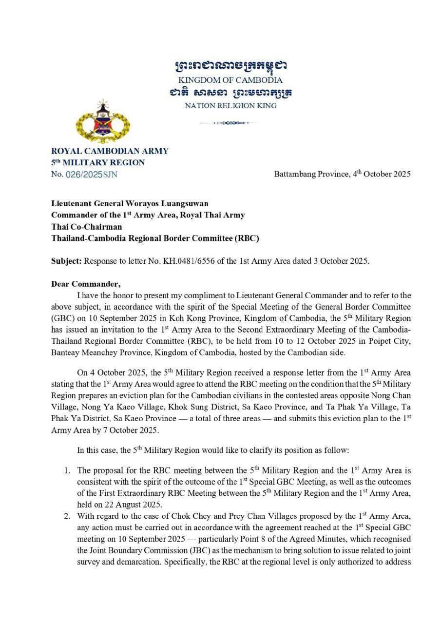 Battambang, October 4, 2025 — The Royal Cambodian Army’s 5th Military Region has formally responded to a letter from Thailand’s 1st Army Area that conditioned its participation in the upcoming Regional Border Committee (RBC) meeting on Cambodia preparing an eviction plan for civilians in three contested areas along the border.