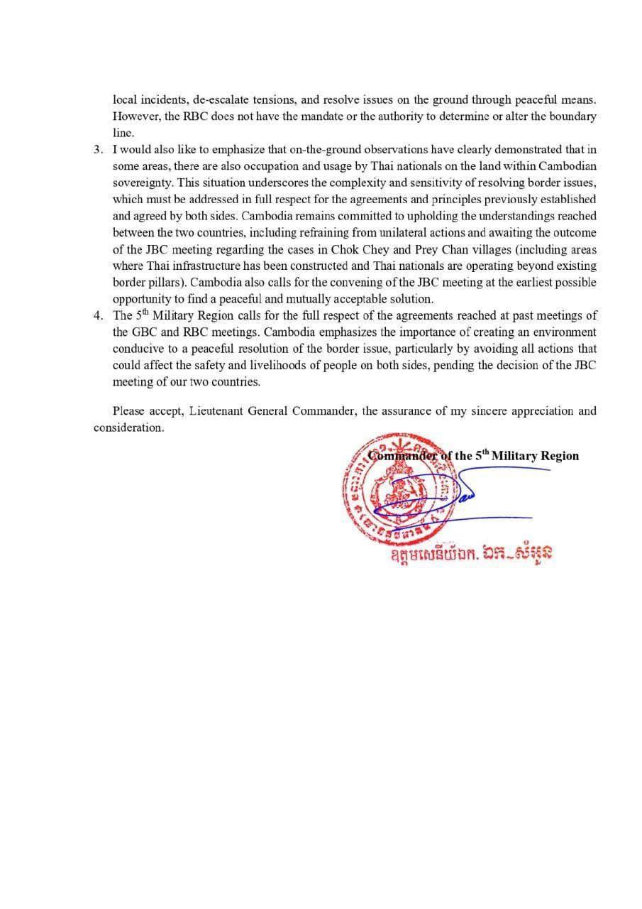 In its official reply, the 5th Military Region reaffirmed that the proposed Second Extraordinary RBC meeting, scheduled for October 10–12 in Poipet City, is consistent with the spirit and outcomes of the First Special General Border Committee (GBC) meeting held on September 10 in Koh Kong Province, as well as previous RBC agreements.