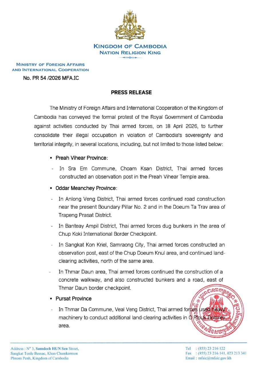 In a statement issued on Sunday, Cambodia’s Ministry of Foreign Affairs and International Cooperation said it had conveyed an official protest to Thailand over actions carried out on April 18, including construction works, bunker digging, land clearing and new observation posts in multiple provinces bordering Thailand.