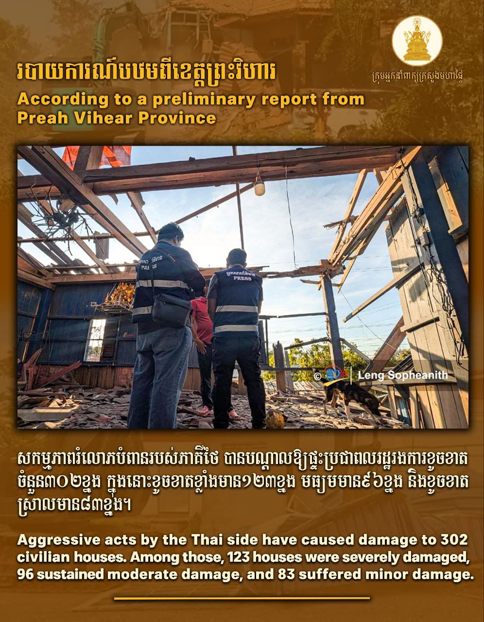 Cambodia Reports Damage to 302 Civilian Houses in Preah Vihear Following Thai Aggressive Acts
