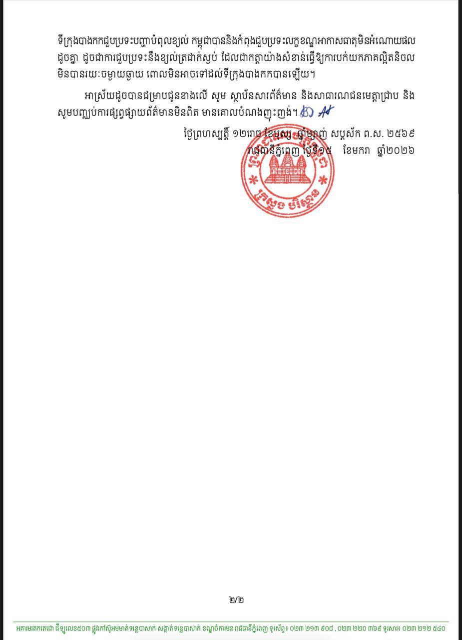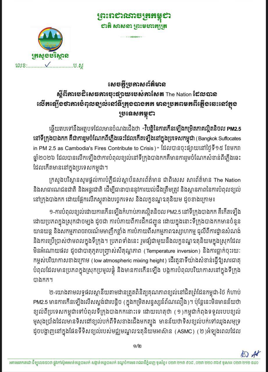 PHNOM PENH, Jan 18, 2026 — Cambodia’s Ministry of Environment today rejected a report by Thailand’s The Nation that blamed air pollution in Bangkok on fires in Cambodia, saying the claim was not supported by technical or meteorological evidence.