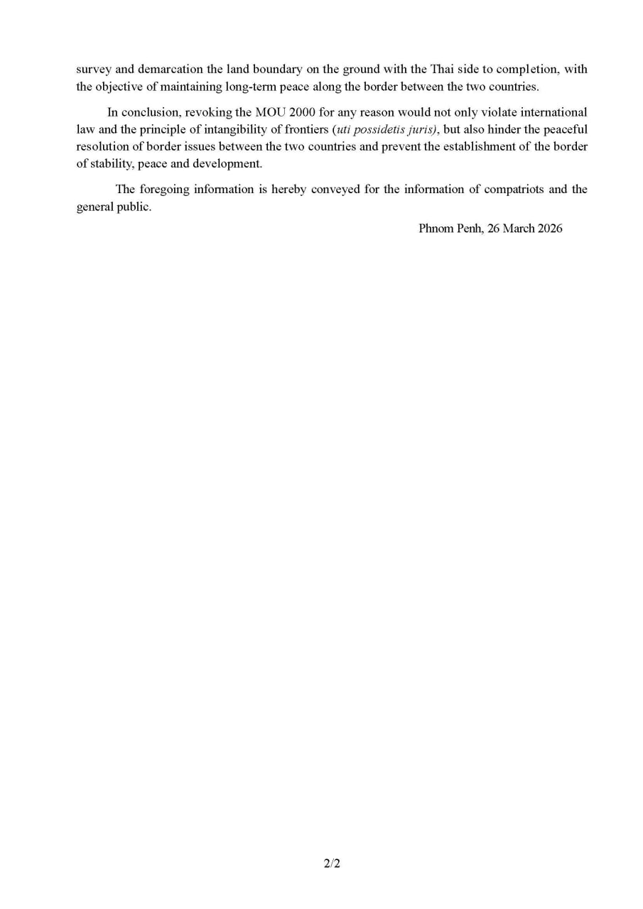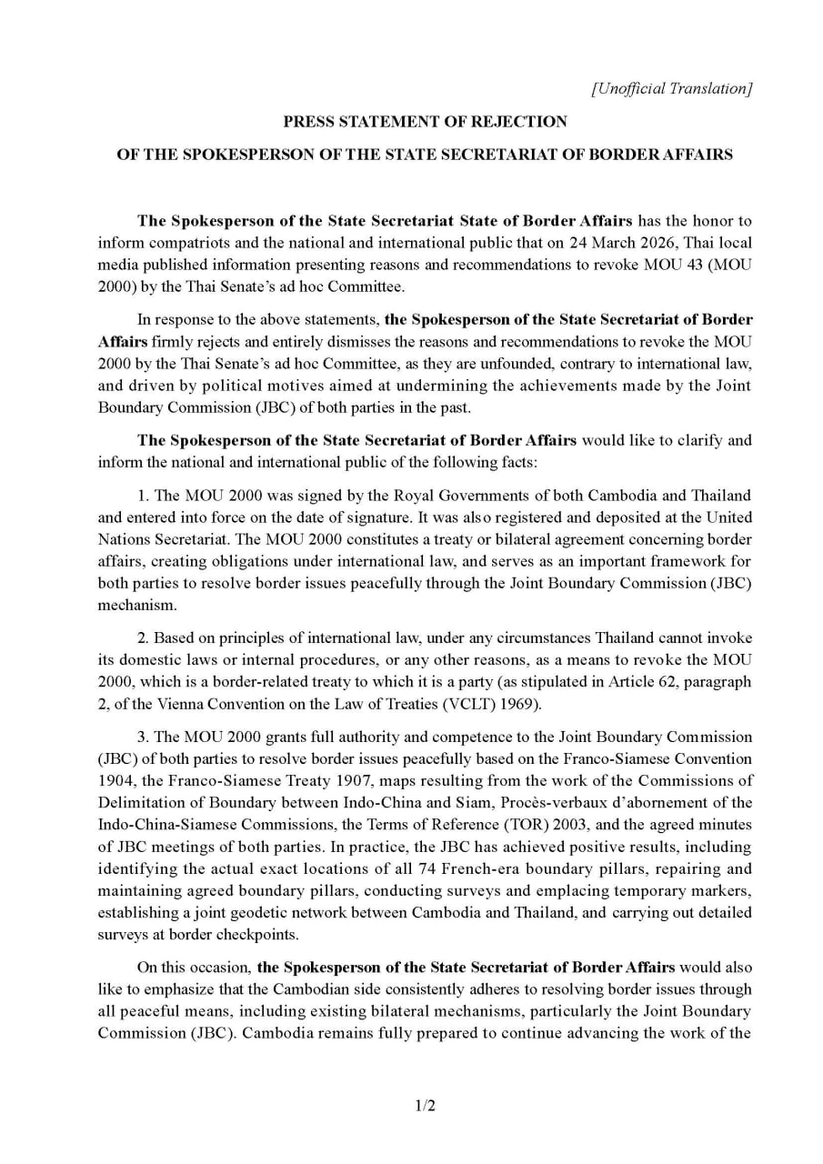 PHNOM PENH, March 26, 2026 — Cambodia has rejected calls by a Thai Senate panel to revoke a long-standing border agreement, warning that such a move would violate international law and undermine efforts to maintain peace along the border.