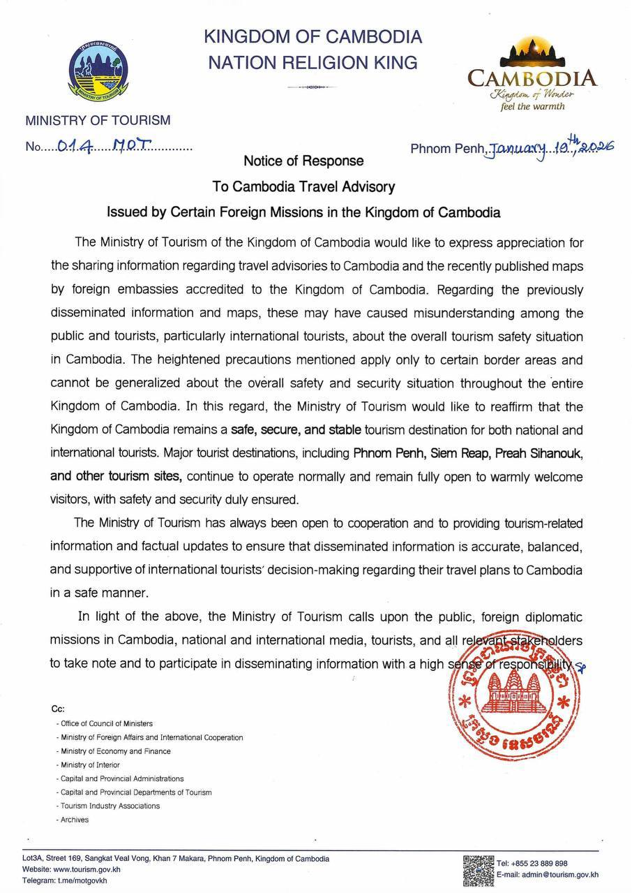 PHNOM PENH, Jan 20, 2026 — Cambodia’s Ministry of Tourism on Sunday reaffirmed that the country remains a safe and stable destination for travelers, responding to recent travel advisories and maps issued by some foreign missions that it said may have caused public misunderstanding.