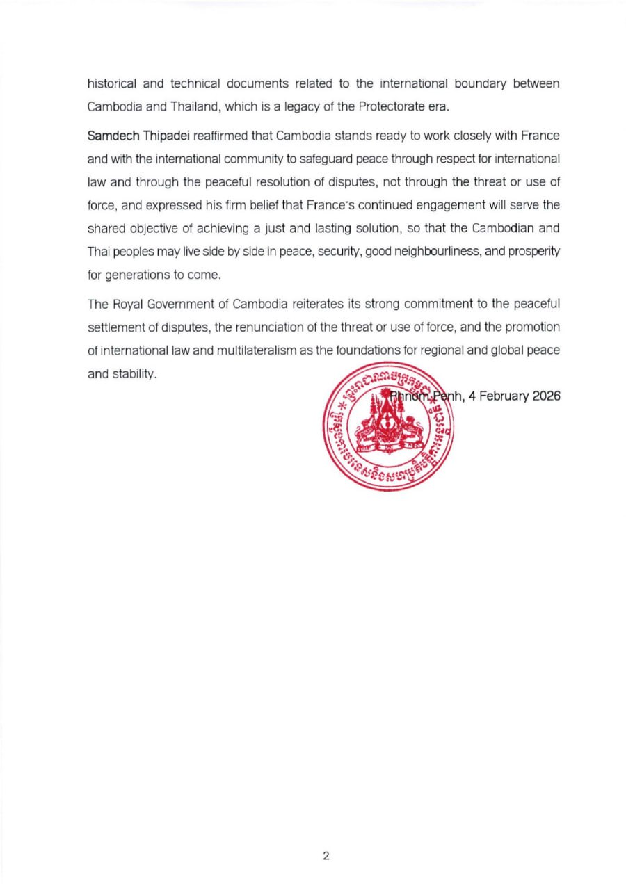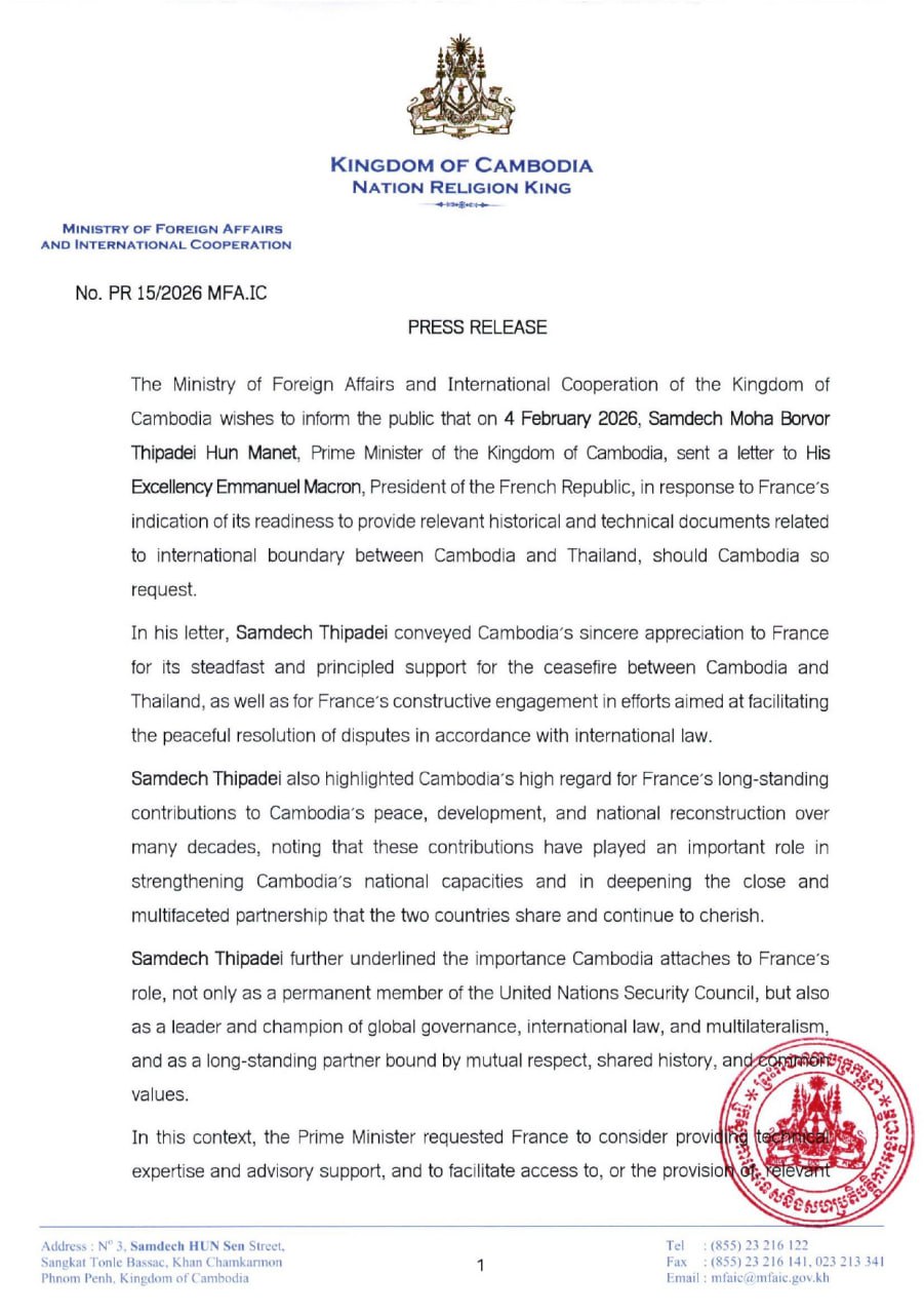PHNOM PENH, Feb. 5, 2026 — Cambodia has formally requested France to provide historical and technical documents related to the international boundary between Cambodia and Thailand, as Phnom Penh seeks a peaceful resolution to ongoing border tensions.