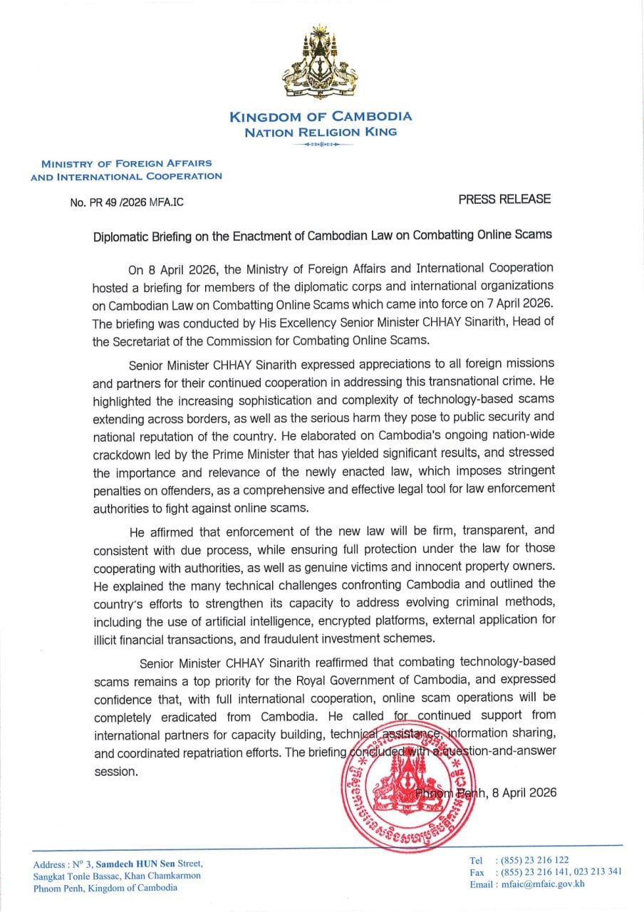 PHNOM PENH, April 9, 2026 — Cambodia has briefed diplomats and international organizations on a newly enacted law aimed at combating online scams, as authorities intensify efforts to tackle transnational cybercrime.