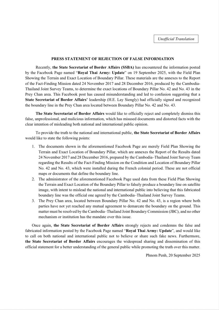 Phnom Penh, 20 September 2025 – The State Secretariat of Border Affairs (SSBA) has issued an official statement firmly rejecting and condemning false information recently circulated by a Facebook Page named “Royal Thai Army: Update.”
