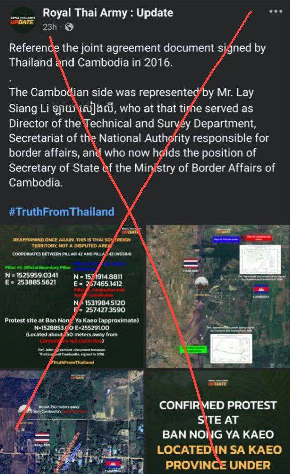 On 19 September 2025, the page published a post containing field plans and coordinates of Boundary Pillars No. 42 and No. 43 in the Prey Chan area, claiming that Cambodian authorities, particularly H.E. Lay Siengly, had signed and recognized the boundary line between the two markers.
