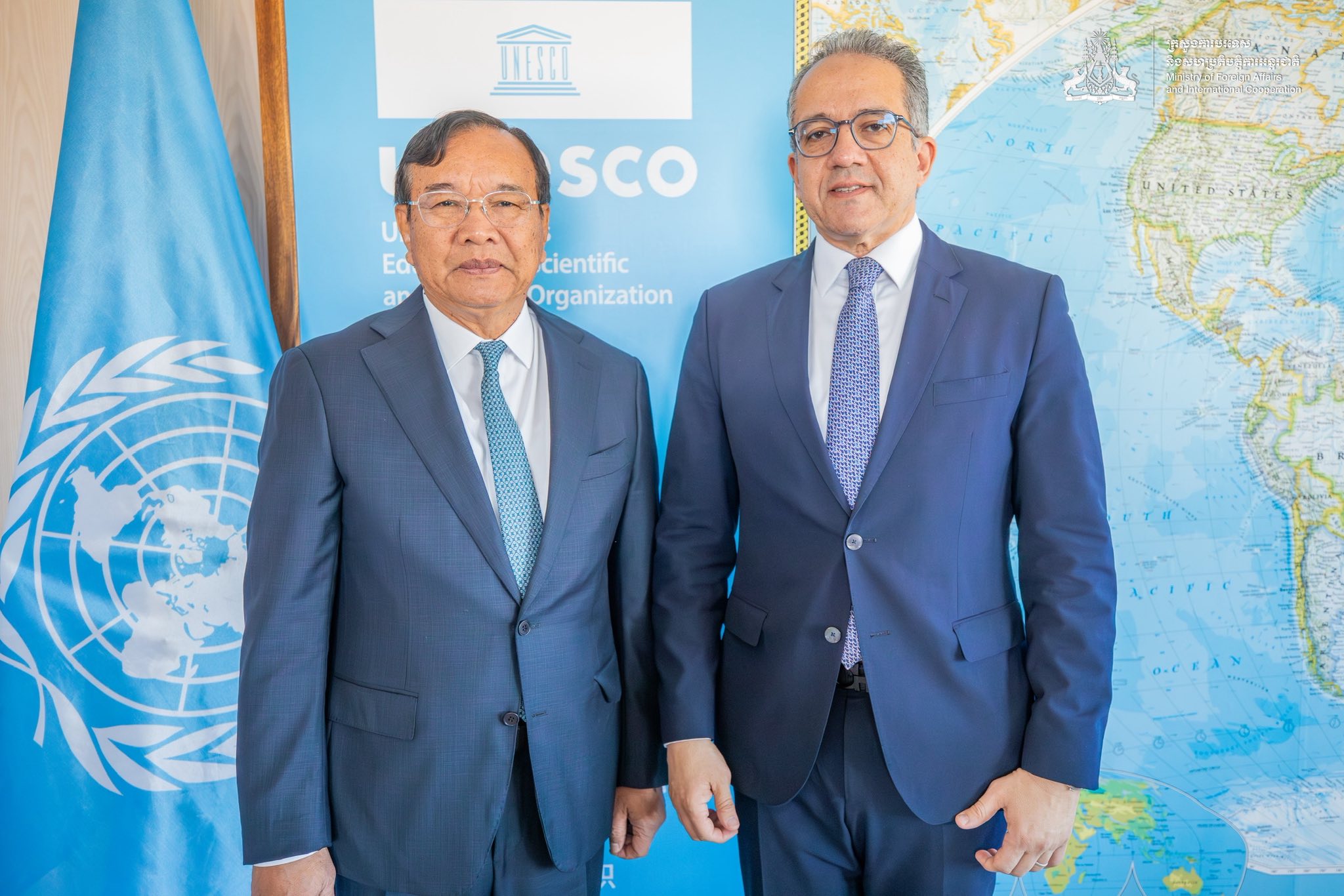 The meeting reflects ongoing engagement between Cambodia and UNESCO in promoting cultural protection alongside dialogue on wider geopolitical issues.