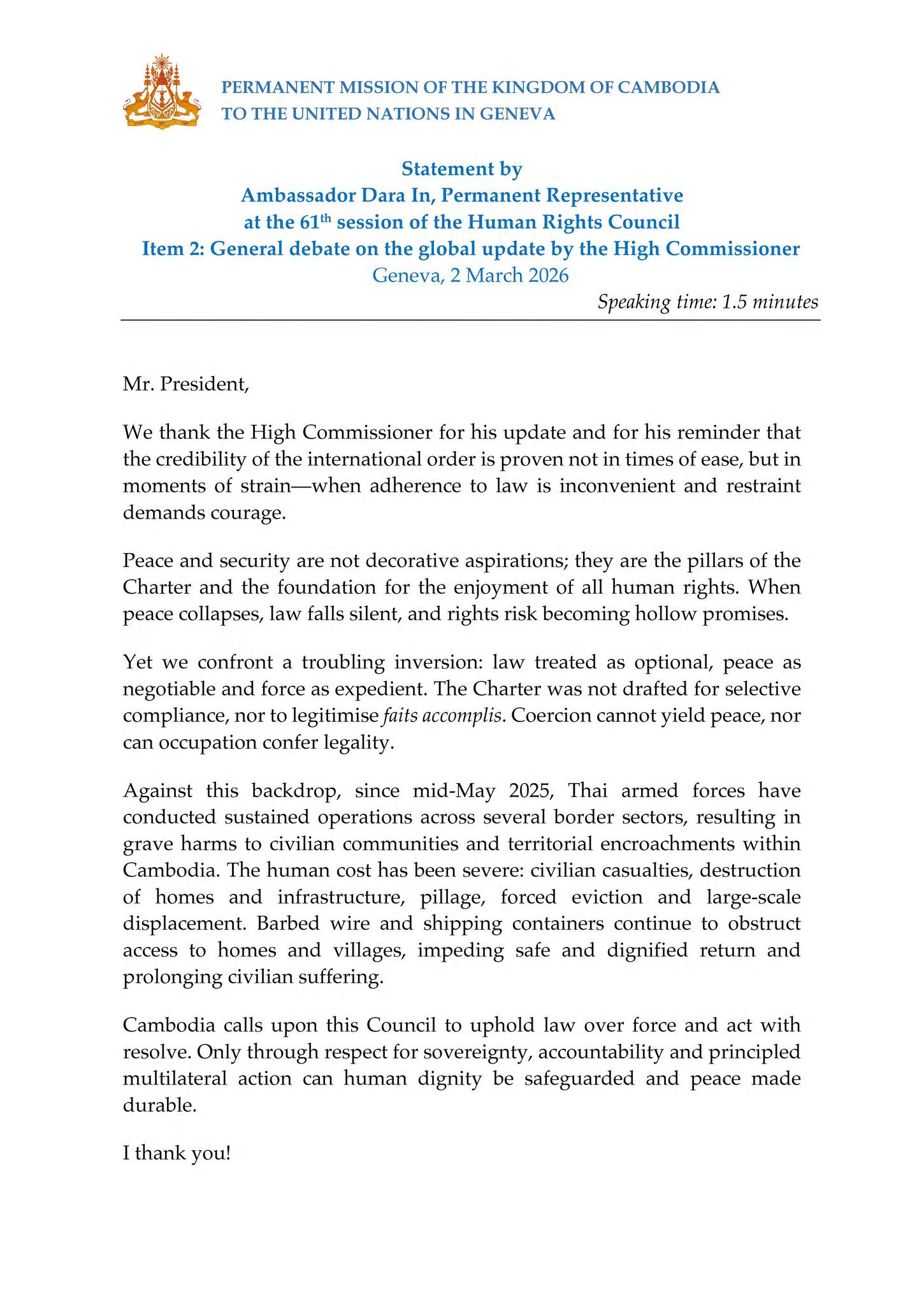 GENEVA, March 3, 2026 — Cambodia accused Thai armed forces of conducting sustained cross-border operations that have caused civilian casualties and territorial encroachments, during a statement delivered at the 61st session of the UN Human Rights Council on Monday.