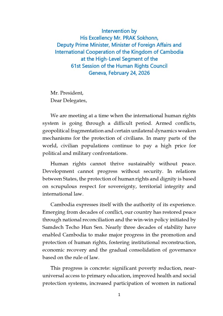 Deputy Prime Minister and Foreign Minister Prak Sokhonn, Speaking at the High-Level Segment of the 61st Session of the United Nations Human Rights Council in Geneva