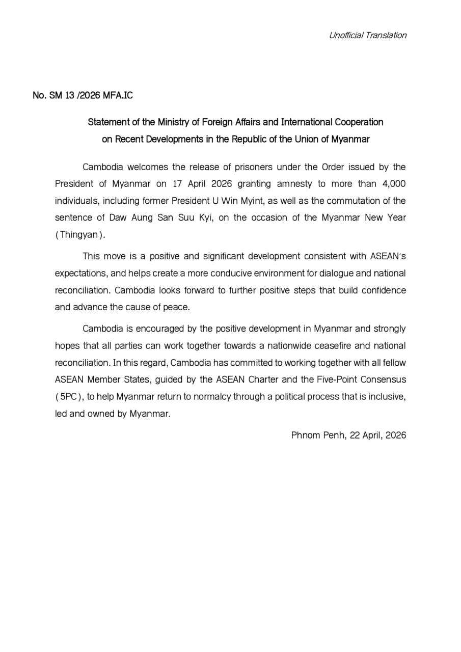 In a statement, Cambodia’s Ministry of Foreign Affairs and International Cooperation said it welcomed the order issued by Myanmar’s president on April 17 granting amnesty to thousands of individuals, including former President U Win Myint, as well as a commutation of the sentence of detained former civilian leader Aung San Suu Kyi.