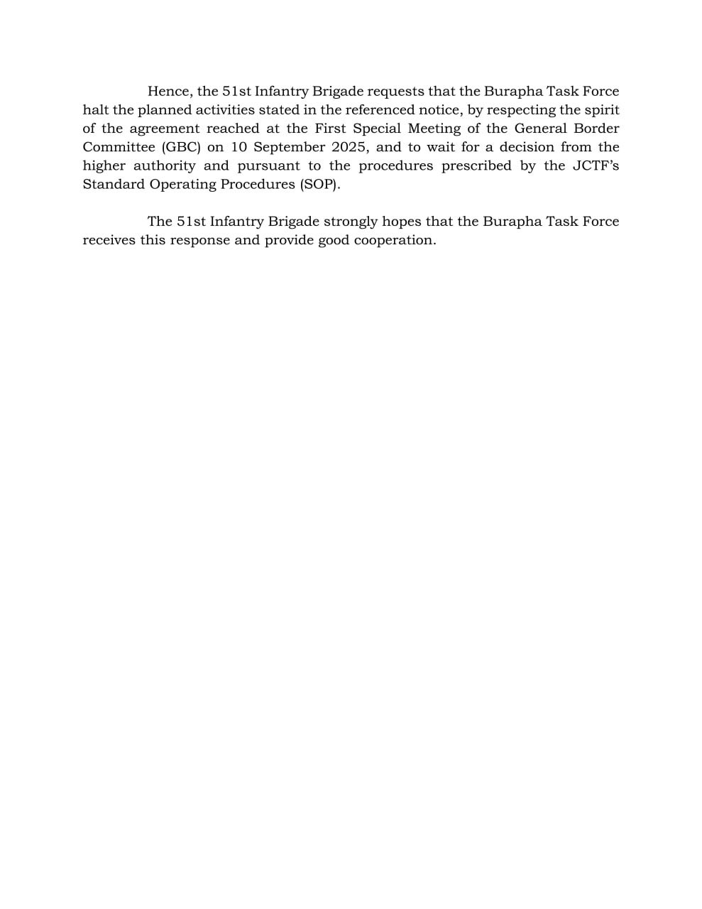 Therefore, the 51st Infantry Brigade formally requested the Burapha Task Force to halt all planned activities mentioned in its notice No. 0481.2/602 dated 8 October 2025, and to await further instruction from higher authorities in line with the JCTF’s Standard Operating Procedures.