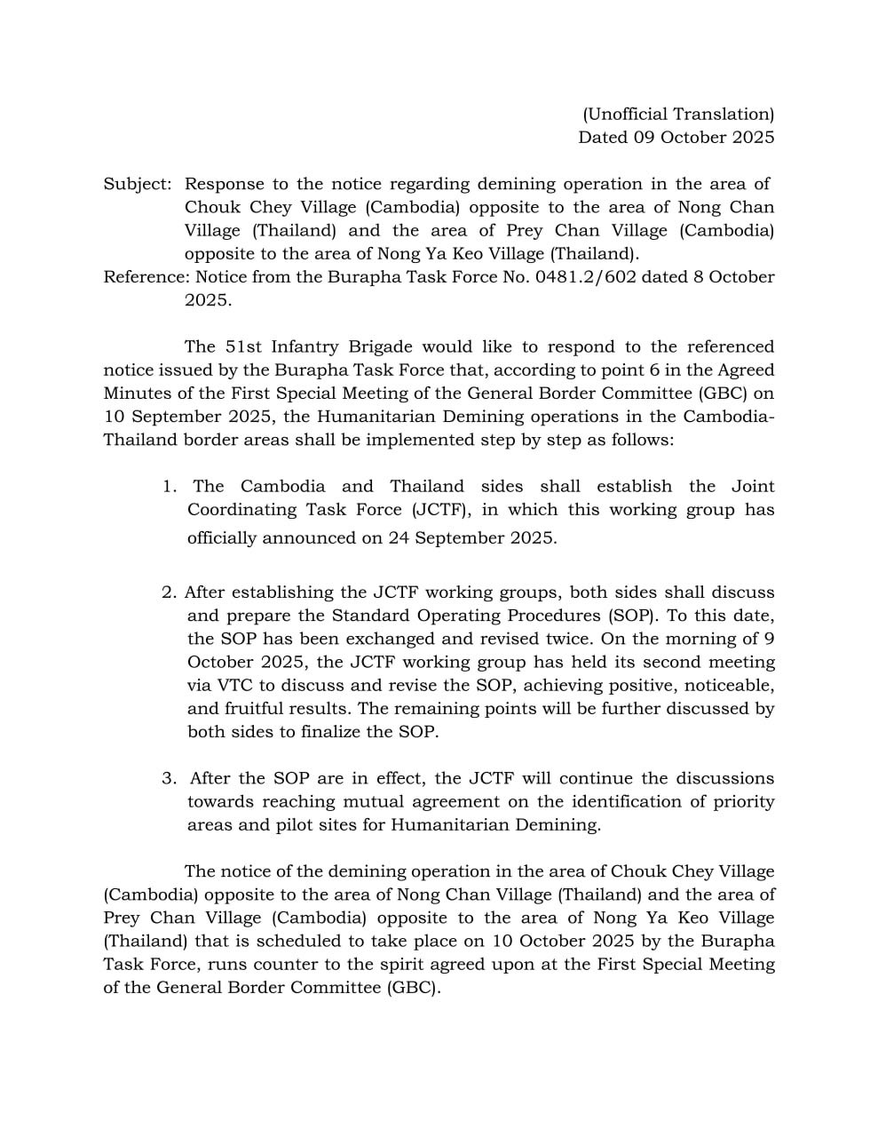 Banteay Meanchey, 9 October 2025 — The 51st Infantry Brigade of the Army Region 5 of the Kingdom of Cambodia has officially issued a letter to the Burapha Task Force of the Kingdom of Thailand, responding to the Thai side’s notice concerning planned demining operations in border areas between Chouk Chey Village (Cambodia) opposite Nong Chan Village (Thailand), and Prey Chan Village (Cambodia) opposite Nong Ya Keo Village (Thailand).