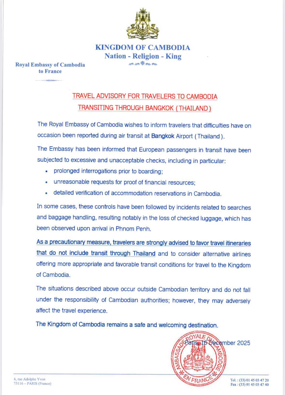 Paris, 16 Decembger 2025 — The Royal Embassy of Cambodia to France has issued a formal travel advisory warning travelers bound for Cambodia of reported difficulties during air transit at Bangkok Airport, Thailand.